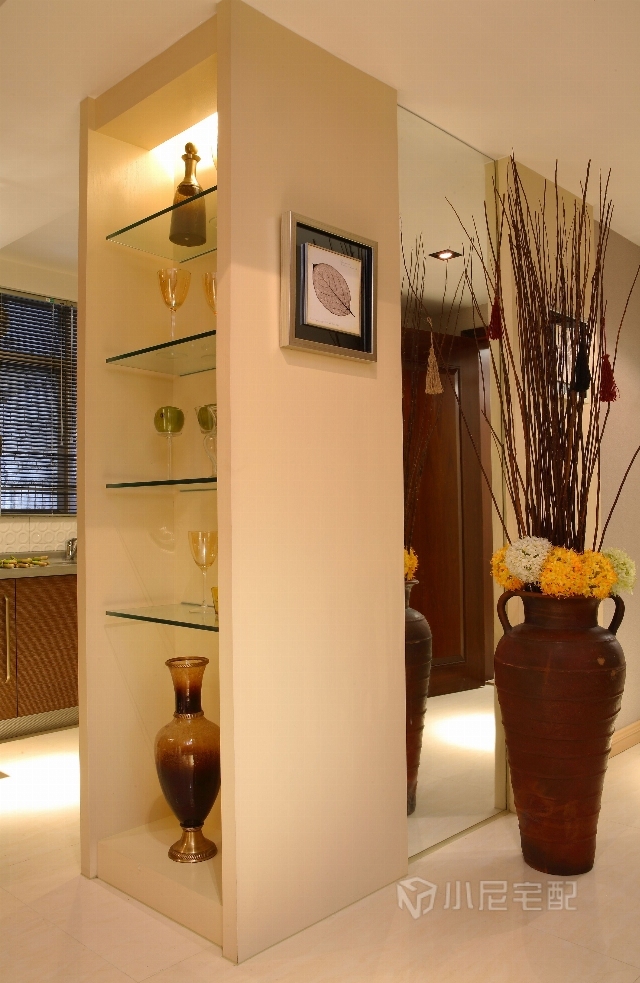 客厅一隅设有专门的陈列柜,一块大的镜面墙延伸了整个空间。