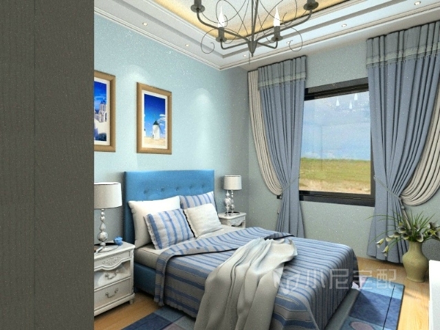次卧,纯白的欧式卧室家具搭配浅蓝壁纸,色彩明快。