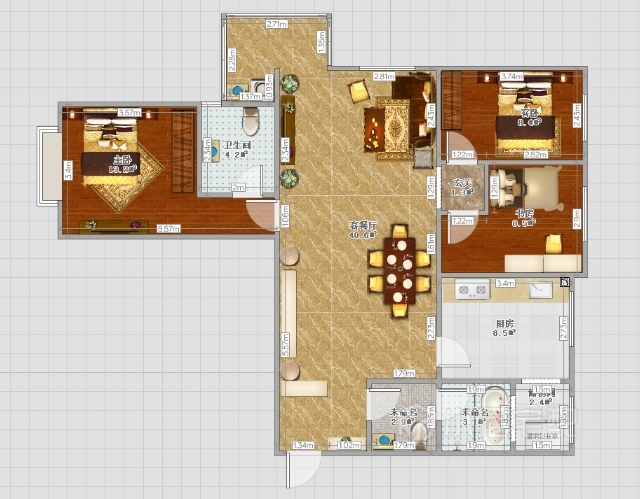 色彩应以统一、和谐、淡雅为宜,对局部的原色搭配应慎重,稳重的色调较受欢迎,本例主要运用到木材质,张显简朴大方之气。