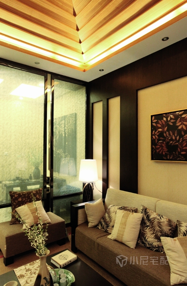 本案结合建筑自身的空间优势将客厅天花做成层层木质叠级再配上灯光及黑镜使空间既深遂又具有视觉冲击力,经典绣花屏风改良成既现代又不失其韵味的夹丝玻璃屏风,使整个空间透出柔美而又令人记忆犹新的混搭情愫。家装家具一体价:20.4万。