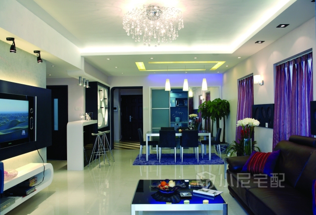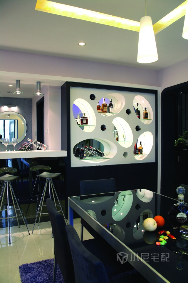酒柜及沙发背景墙饰椭圆形蜂巢的奇特造型寓意专为新婚业主打造的甜蜜“爱巢”。而隐含在空间各部位的“L”造型元素是将男女主人姓氏拼音首位字母与他们的新居巧妙地结合在一起,全屋紫灰熏衣草色系缀以艺术玻璃、灰镜等材质,营造出对比强烈的时尚气息,彰显出业主的不凡品味。家装家具一体价:19万。