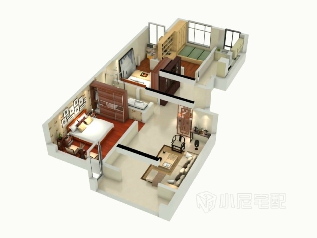卫生间:做干湿分离,在此处应有门(渲染要求去掉了)将洗衣机与台盆做在一处,既节约了空间又使整个空间不会呆板赋予狭小空间的色彩多变。