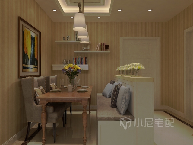 现代简欧,多以现代风格为主,进户门餐厅区域利用壁挂层板增加了放置空间,同时利用卡座增加收纳空间