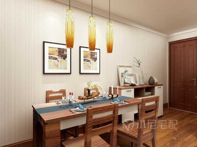 简单的挂画,橘色的长线吊灯,淡雅的条纹壁纸,一套餐桌椅,一个餐边柜就营造了一个非常舒适的就餐环境。
