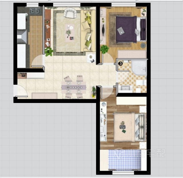 白色的橱柜,淡蓝色方格墙砖,黄色地砖,彰显着轻松,随性的生活态度