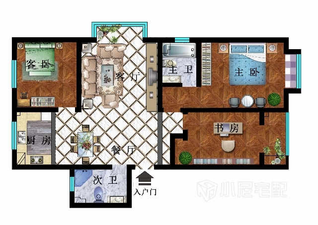 拼花地砖显得高贵奢华,大大的落地窗让整个空间通透明亮。
