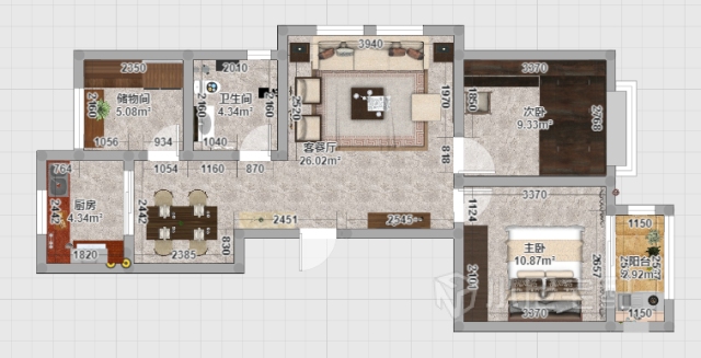 储物间在厨房旁边,因为厨房餐厅空间有限,冰箱安排在此,高柜用来放衣服矮柜用来放一些厨房用品,给主人留足储物的地方。