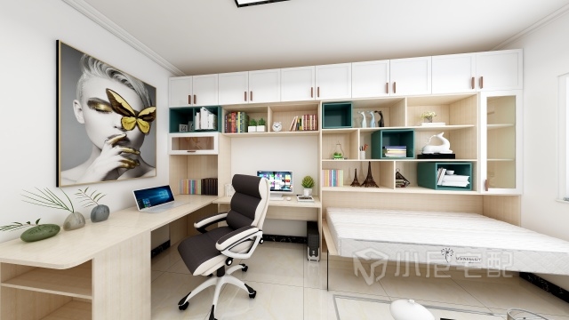 书房这个房间功能可强大了 折叠式书桌 增强了工作场地 收起来也是收纳性很强的书柜并节省了书房的空间 还有侧翻床也是一样 既是书房又是客房 帮帮哒