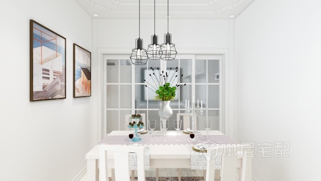 白色配套餐桌加上绿色植物花瓶点缀,墙面暖色装饰画让人食欲大增